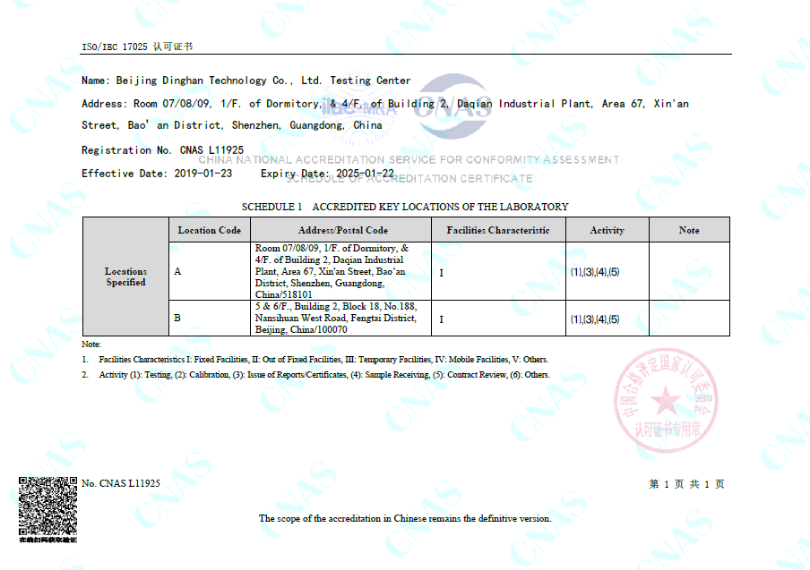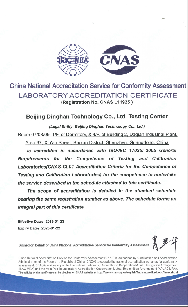 北京鼎漢技術(shù)股份有限公司檢測中心已獲CNAS(中國合格評定國家認可委員會)認可,認可能力范圍已正式在CNAS官網(wǎng)公布,認可的檢測能力范圍包括電子電氣環(huán)境可靠性檢測、電源產(chǎn)品及相關(guān)設(shè)備的電氣安全和性能檢測項目。