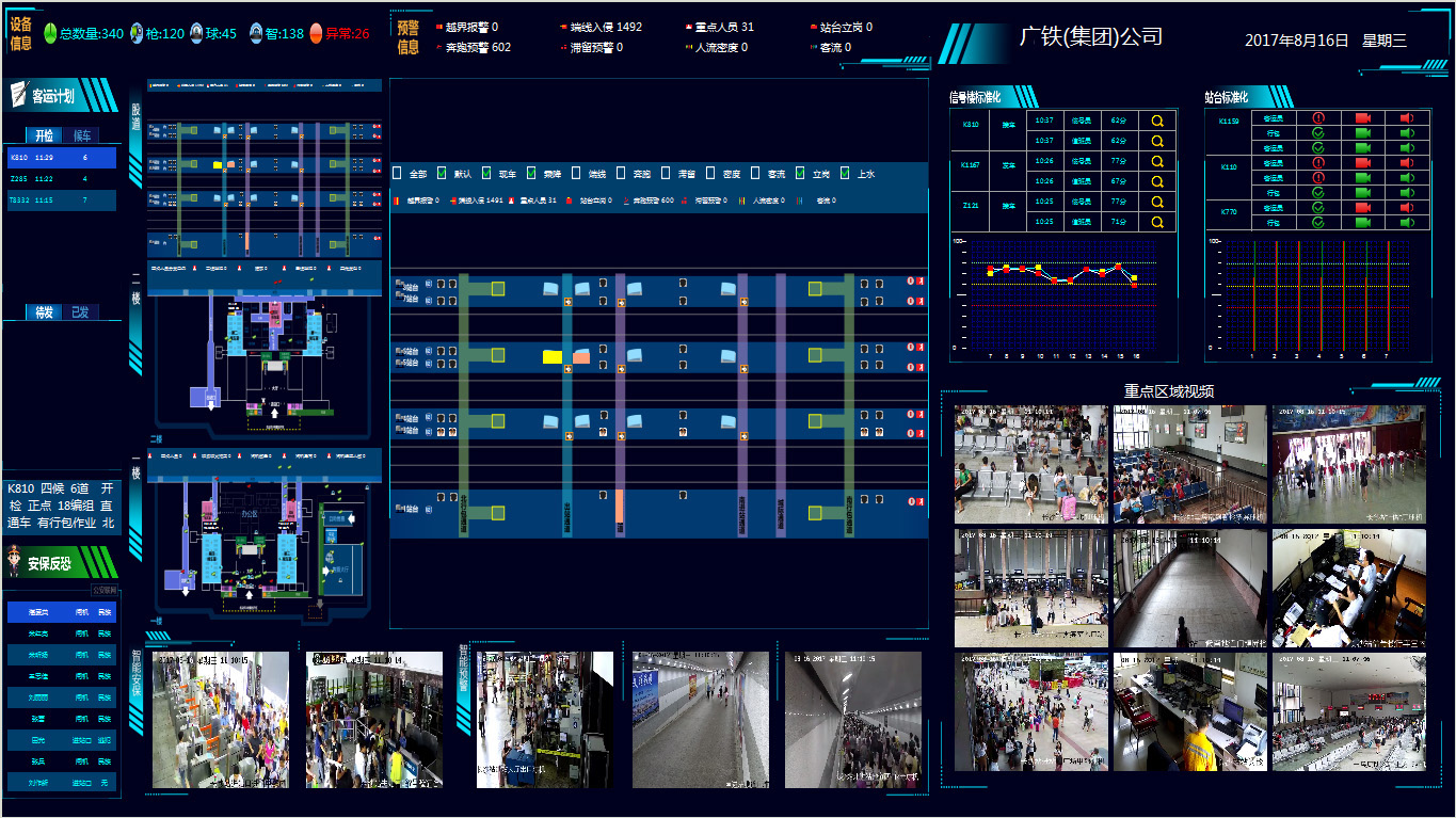 本系統(tǒng)包括作業(yè)標(biāo)準(zhǔn)智能監(jiān)控系統(tǒng)、旅客安全智能防護(hù)系統(tǒng)、旅客服務(wù)智能交互系統(tǒng)、安全管理智能智慧系統(tǒng)和智能綜合管理信息平臺(tái)等,實(shí)現(xiàn)了全站客運(yùn)作業(yè)的監(jiān)控管理和協(xié)調(diào)指揮。本系統(tǒng)根據(jù)車站客運(yùn)作業(yè)場(chǎng)景特征,專業(yè)定制語(yǔ)音、動(dòng)作、 行為等數(shù)據(jù)模型,融合運(yùn)用音視頻分析、傳感器感知、數(shù)據(jù)分析等技術(shù),通過(guò)智能綜合管理信息平臺(tái)實(shí)現(xiàn)數(shù)據(jù)共享和聯(lián)動(dòng)智 能控制。系統(tǒng)結(jié)構(gòu)合理,可根據(jù)用戶需求組合模塊,兼容性、擴(kuò)展性強(qiáng)。通過(guò)“人防、物防、技防”夯實(shí)了客運(yùn)安全基礎(chǔ), 提升了客運(yùn)服務(wù)品質(zhì)和管理水平。