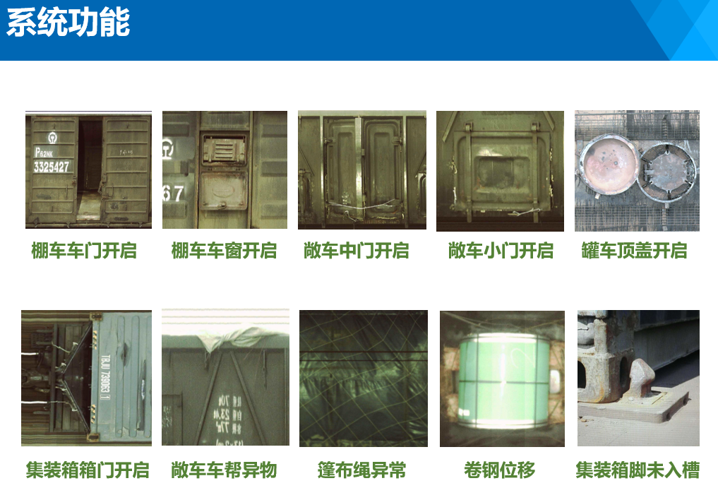 該系統(tǒng)在既有貨檢視頻基礎(chǔ)上,增加圖像比對(duì)識(shí)別報(bào)警功能,即當(dāng)鐵路貨物列車行經(jīng)該視頻監(jiān)控區(qū)域時(shí),能自動(dòng)檢測(cè)判 別車輛門窗蓋閥關(guān)閉、篷布及篷布繩網(wǎng)苫蓋和貨物裝載加固不良等影響行車安全的情況,及時(shí)通過(guò)語(yǔ)音、標(biāo)注等形式報(bào)警通 知當(dāng)班人員,提醒重點(diǎn)檢查確認(rèn)。該系統(tǒng)為改善貨檢作業(yè)流程和改革貨檢作業(yè)模式提供了有利條件,推動(dòng)了貨檢作業(yè)由精細(xì) 化向精準(zhǔn)化轉(zhuǎn)變,實(shí)現(xiàn)了貨檢作業(yè)“用數(shù)據(jù)說(shuō)話、靠數(shù)據(jù)決策、依數(shù)據(jù)行動(dòng)”。