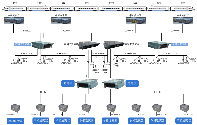 -- 輔助變流器將牽引變流器中間直流環(huán)節(jié)的直流電轉(zhuǎn)換為三相440V/60Hz交流電,為車載設(shè)備提供中壓電源。